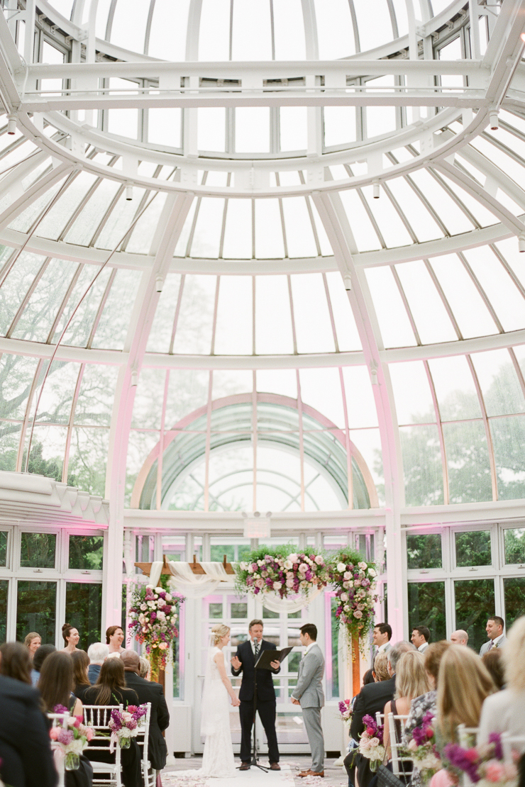As Sue began to put on her beautiful wedding dress from Rivini By Rita Vinieris at the Marriott Hotel at Brooklyn Bridge, the drizzle started to slow down. By the time we arrived at the Palm House, the rain had completely stopped! We were in luck!! It was an emotional first look between Sue and Chris inside the stunning Brooklyn Botanic Gardens. Afterwards, we walked the gardens making stops at Bluebell Wood, the Rose Garden and Magnolia Plaza during their bridal portraits. As I photographed the very last family photo, the rain started again. It was divine timing if I have ever seen it! Our two hour window for photos was absolutely rain-free!! Sue and Chris held their wedding ceremony inside the breathtaking Palm House at the Brooklyn Botanic Gardens.
